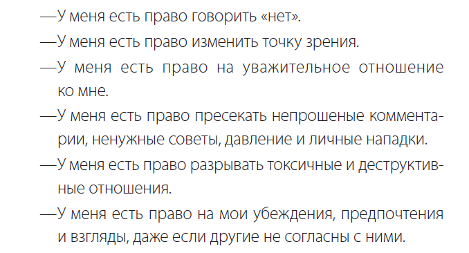 Ежедневно напоминайте себе о том, что у вас есть право на свое мнение, чувства, желания и потребности. Запишите несколько фраз и держите их под рукой.